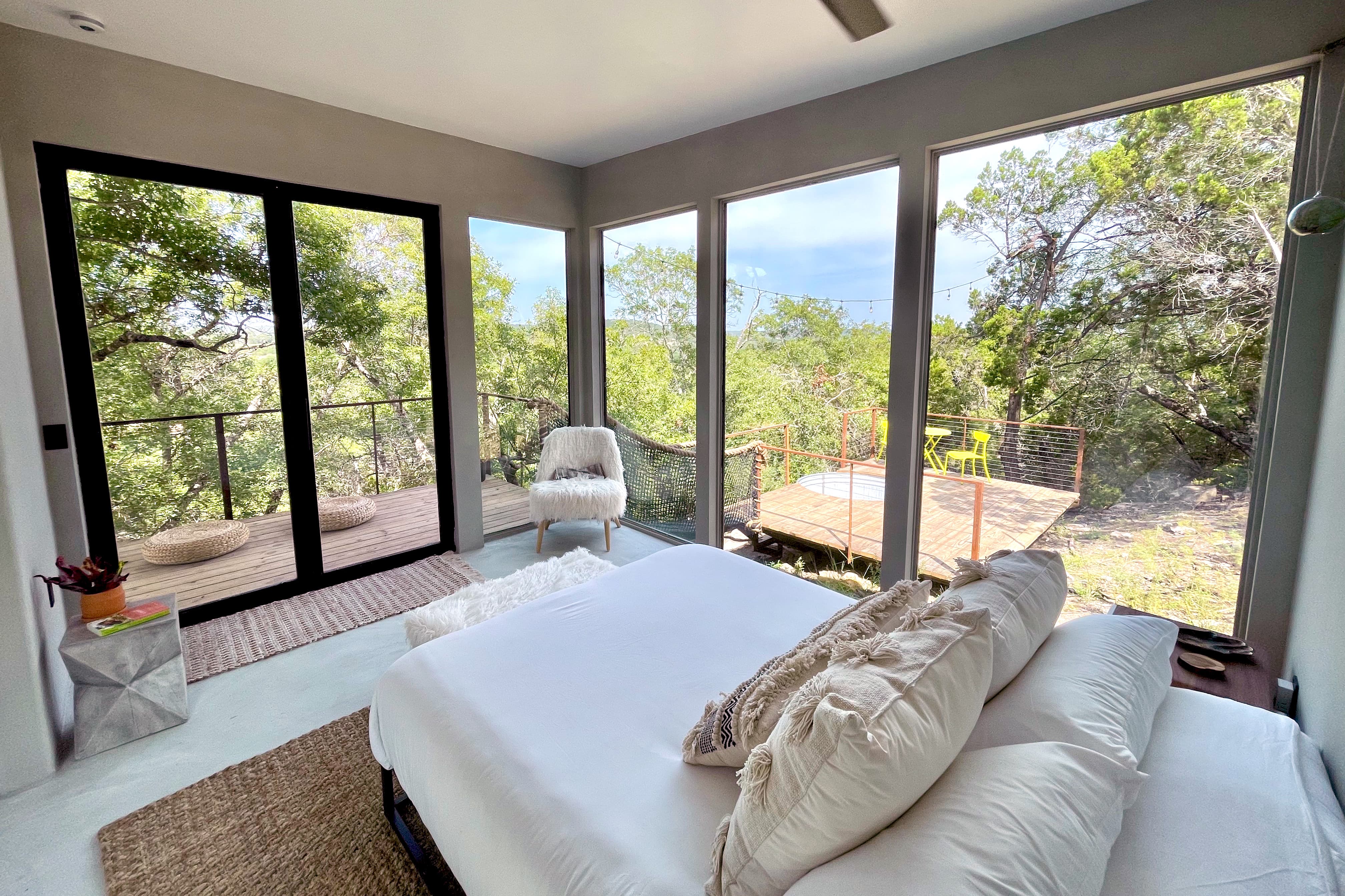 Rame is perched on a ridge overlooking our 100-acre Hill Country property, this modern, minimalist Mexican casita has a Santorini-inspired archway & French doors. Plush as ever, it’s fully outfitted for big comfort & big views with floor-to-ceiling glass walls. We also threw in a bridge between the villa & the deck, just for fun. Plunge in your personal hot tub. Say hi to our mini cows! Grill a feast on your Blackstone grill & enjoy sunset dining on the huge deck. It’s elevated camping with the comforts of home including of course, AC, and a private in room shower and bathroom. See a full tour of Rame by Levi Kelly the show Tiny BNB on the Design Network! https://youtu.be/ExkEWMfos5U